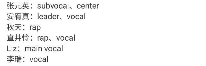 ive成员刚对外透露了对自己在队内的定位,其中成员张元英对自己的定位是“subvocal、center”,安宥真对自己的定位是“leader、vocal”,秋天认领的定位是“rap”,直井怜选择的定位标签是“rap、vocal”,Liz选择的定位是“main vocal”,李瑞选择的定位标签也是“vocal”。ive成员们对自己的定位很坚定,可以说全员vocal团,没有一个成员说自己是舞担。