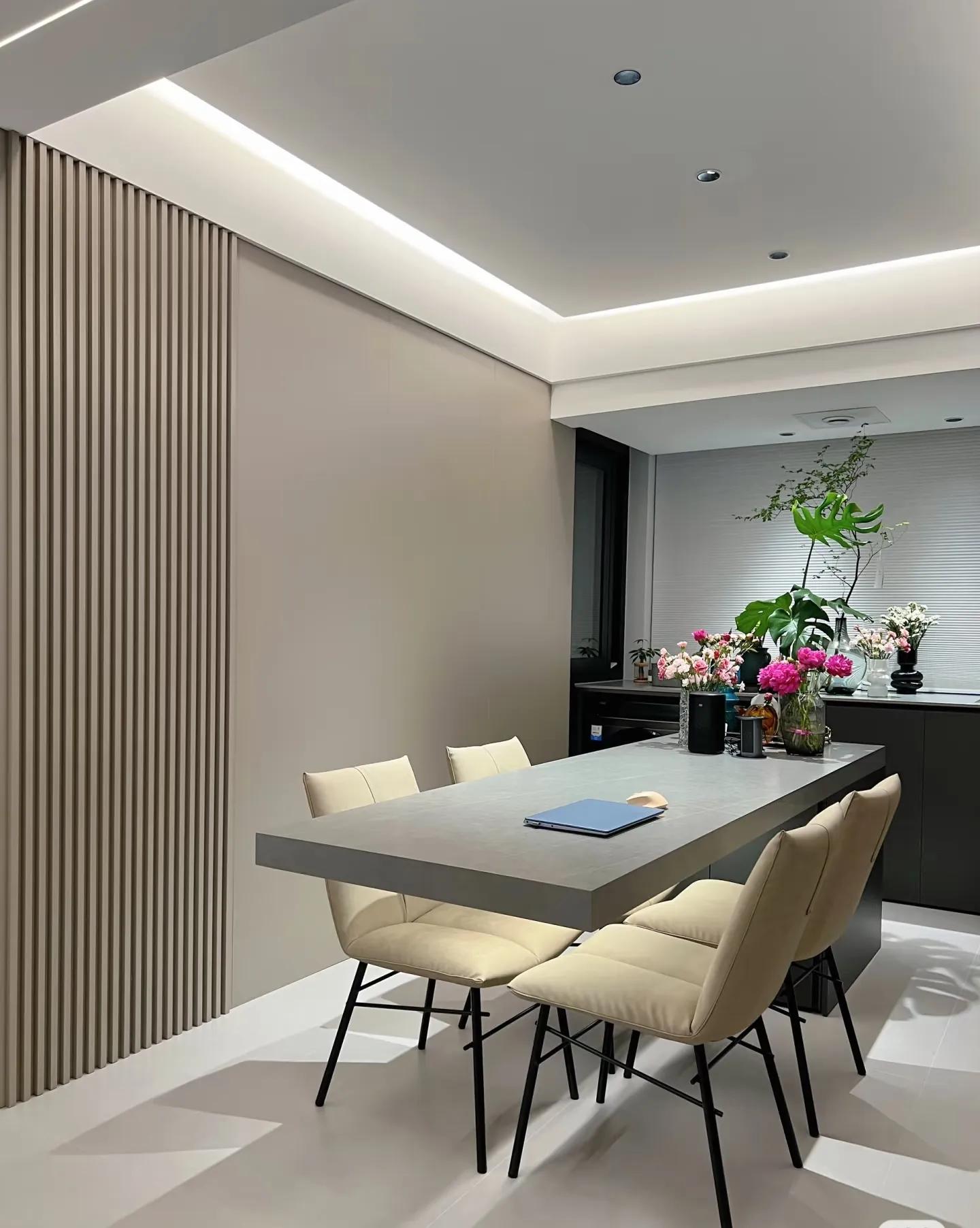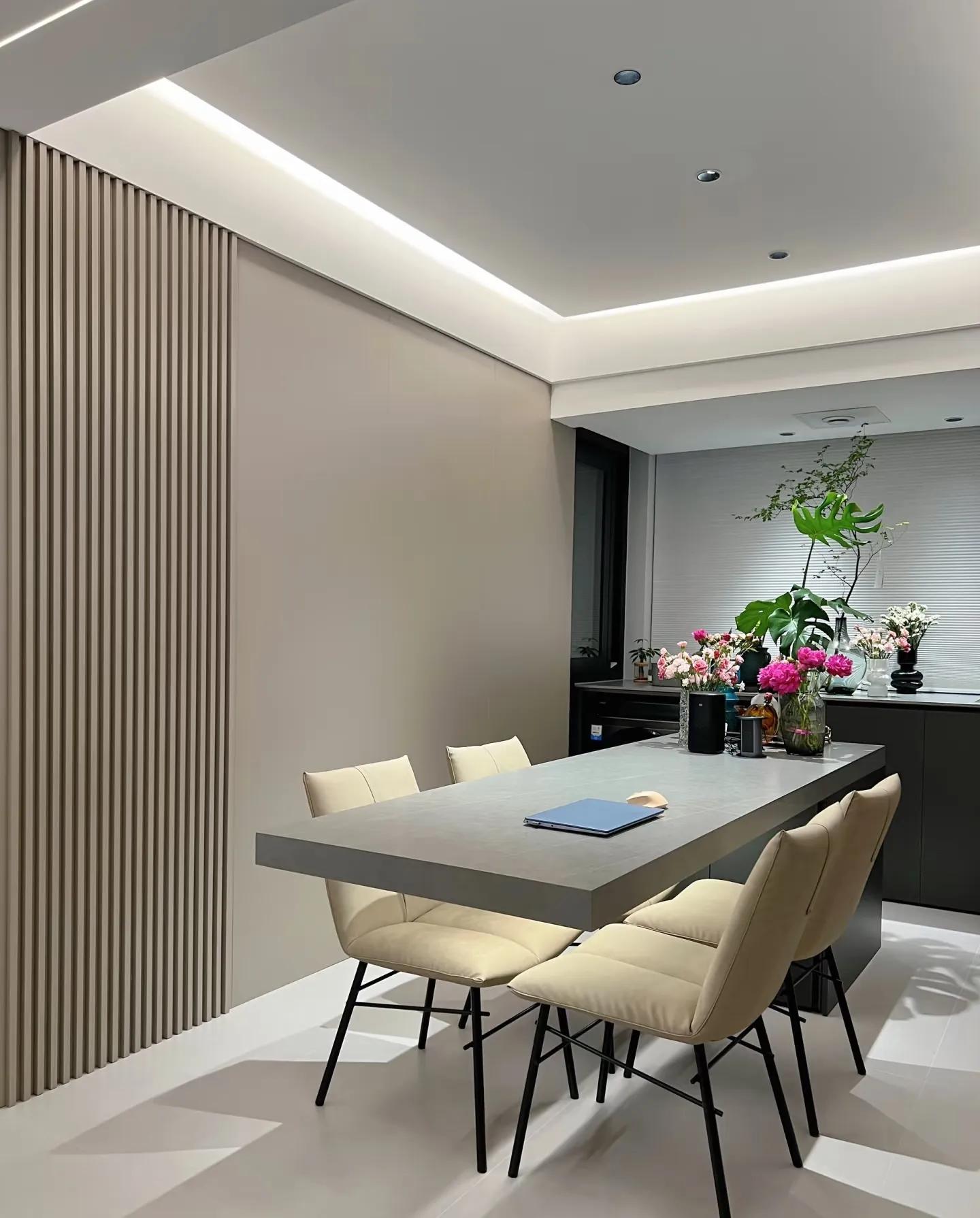 餐厅区域背景墙木饰面上墙,效果很不错啊!餐桌悬浮餐桌设计,真心挺棒的。侧边规划半高储物柜。