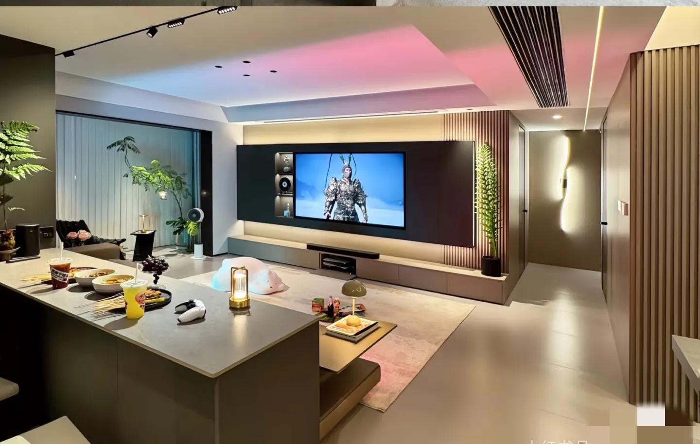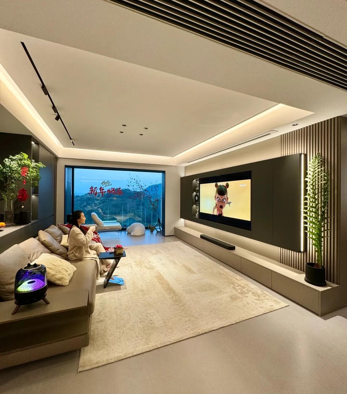 客厅区域电视背景墙设计大气上档次,真心不错!木饰面➕装饰柜➕落地电视柜,电视内嵌进去。