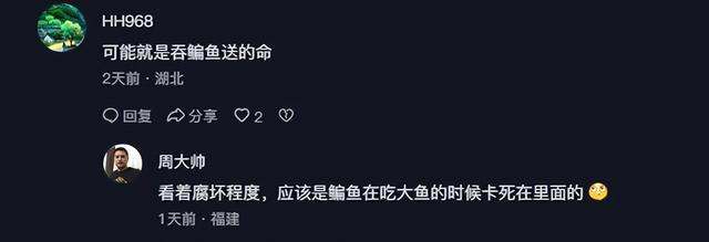 不过也有一位福建的网友提出了不同的看法,他认为鱤鱼和鳊鱼的腐坏程度完全不匹配,这条鱤鱼显然已经死亡多时,但是鳊鱼看起来却是刚死没多久。
