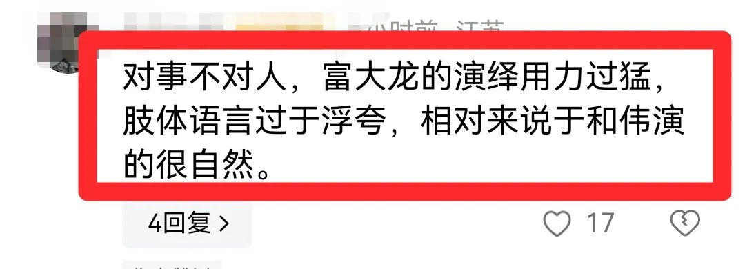 还有网友说,“对事不对人,富大龙的演绎用力过猛,肢体语言过于浮夸,相对来说于和伟演的很自然。”