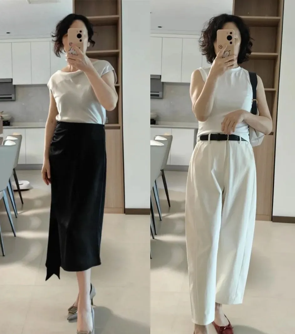 我们可以参考博主的搭配思路:用高腰半身裙配无袖衫,优雅知性;白色背心+同色九分裤,再以黑色腰带做点缀层次感十足,能轻松穿出轻盈高级感。