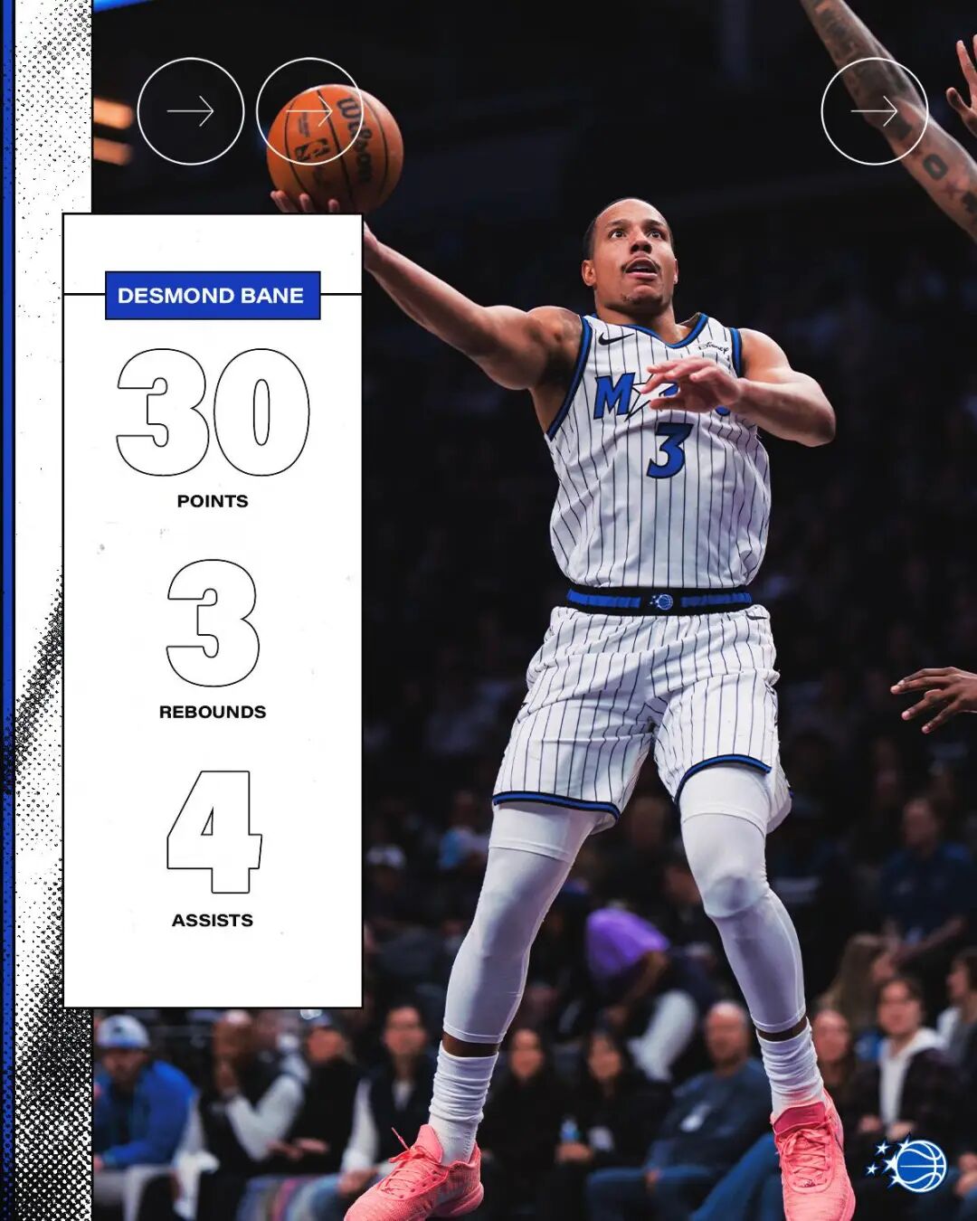 这场比赛,魔术当家球星之一,戴斯蒙德贝恩再次打出了优秀表现:出战33分钟,投篮17中10,罚球10中10,得到30分3篮板4助攻。