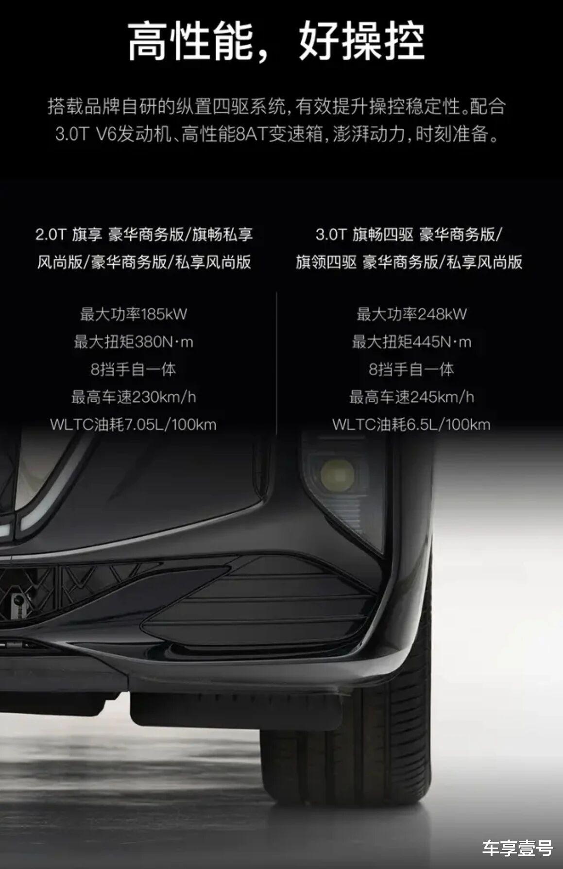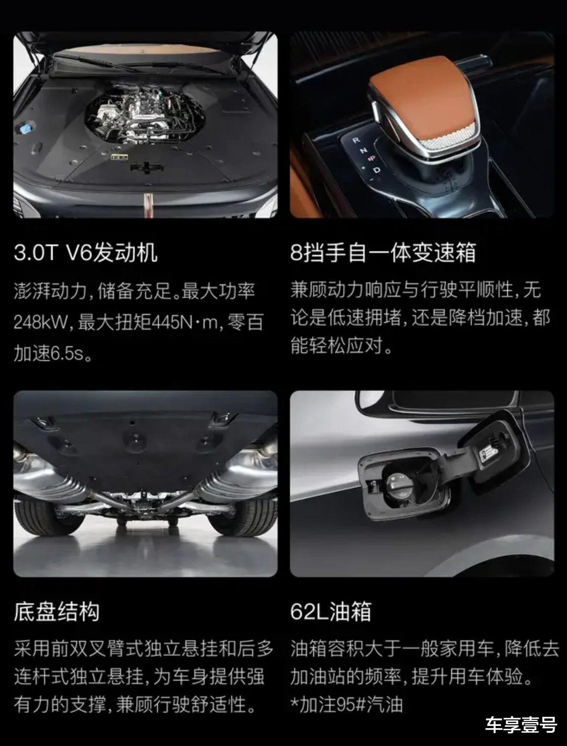 而3.0T的V6发动机,采用机械增压,马力也提升到了337匹,扭矩来到了445牛米,0百加速时间6.5秒,跟BBA相比,丝毫不落下风,而且还有全铝合金的副车架,以及高配车型的空气悬挂加持,完美契合中式豪华旗舰的定位。