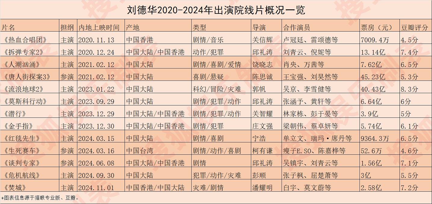 2024年:刘德华推出了三部主演电影和一部参演电影《谈判专家》,但票房表现依然未能令人满意。票房最高的《危机航线》总票房为3亿人民币,而他独立主演的《红毯先生》票房惨淡。