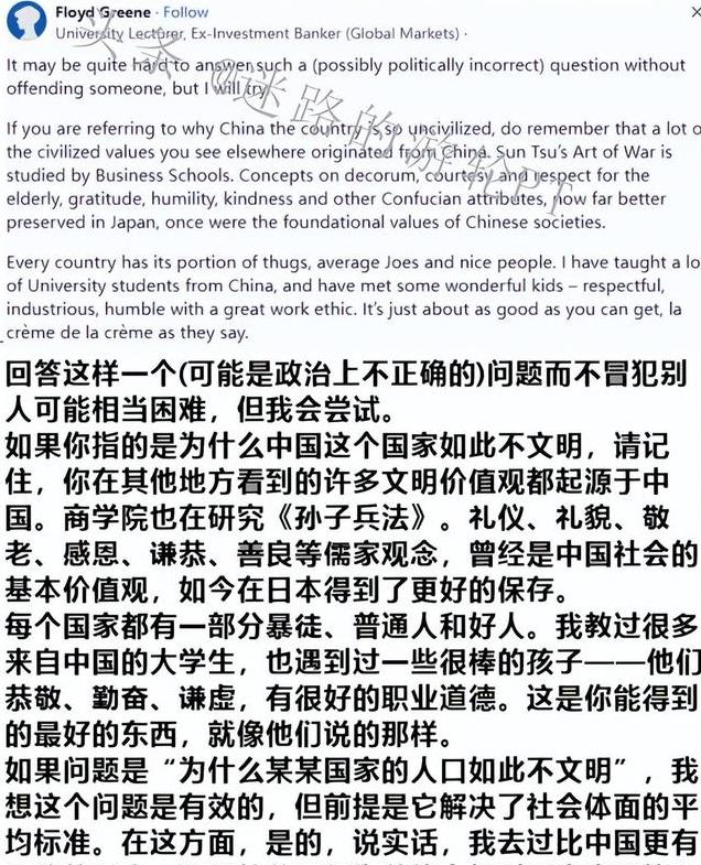 许多外国网友开始纷纷发表评论,有的表达质疑,有的则给出了所谓的“答案”。然而,这个问题一出,立即引发了全球网友的激烈反应。Floyd Greene的外国网友说道: