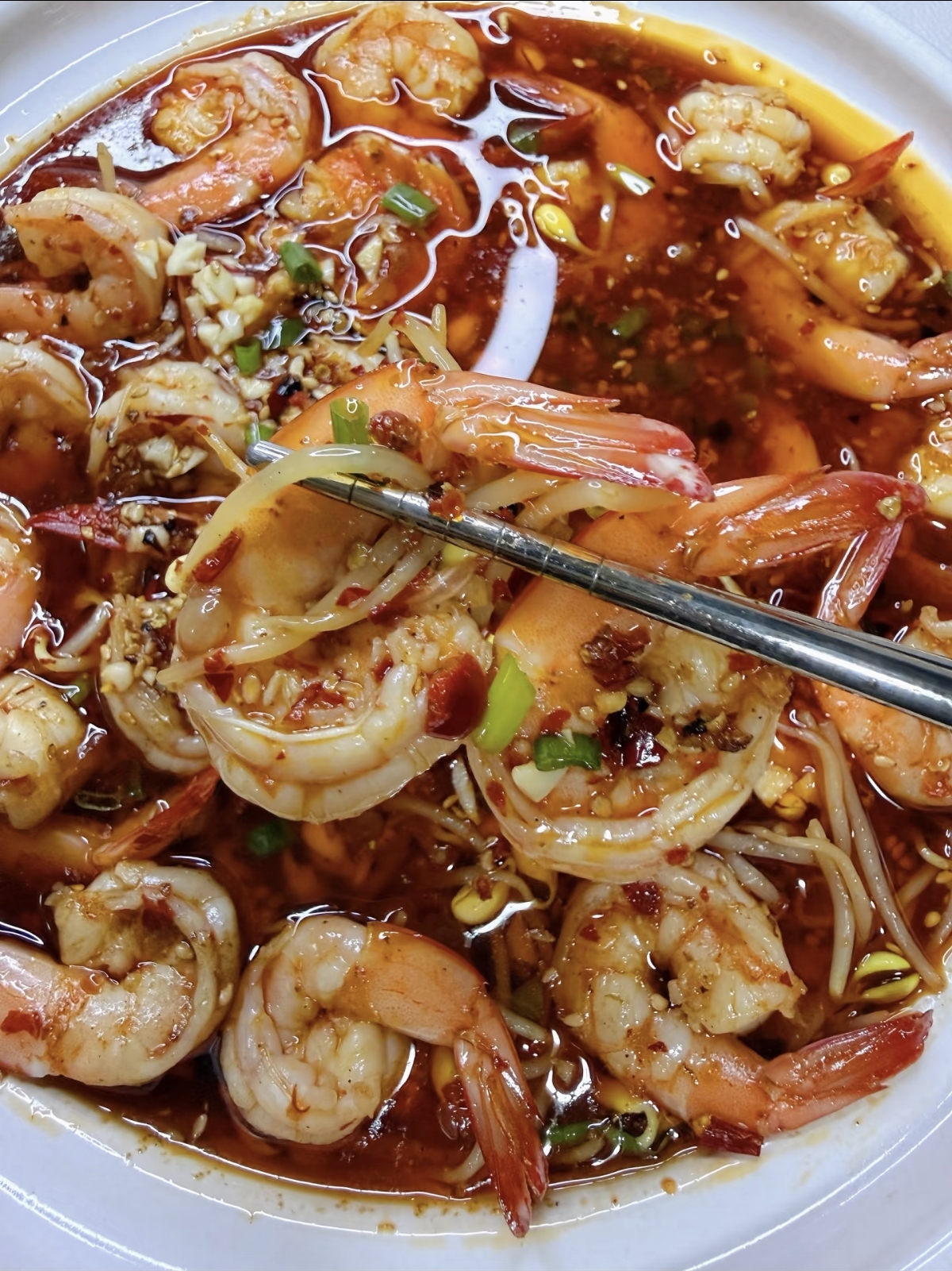 为了增加口感的丰富度,我建议在碗底铺上一层焯过水的豆芽或莴笋片。将煮好的虾连汤带水倒入碗中,最后撒上蒜末、葱花和辣椒面。最激动人心的一步来了:烧一勺滚烫的热油,“刺啦”一声淋在佐料上。瞬间,花椒的麻、辣椒的辣、蒜蓉的香被热油彻底激发出来,香气直冲云霄,简直能把邻居都馋哭!