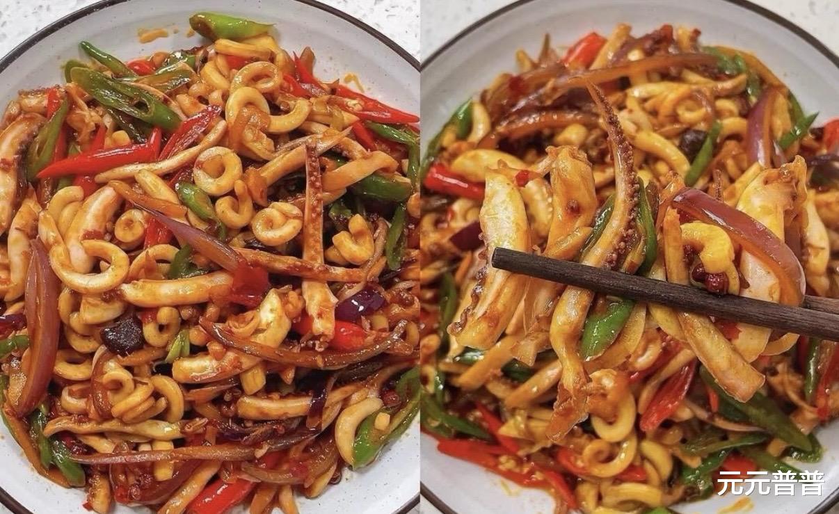 鱿鱼焯水一分钟,搭配姜蒜花椒和豆瓣酱爆炒,脆嫩弹牙,香辣浓郁,比烧烤还诱人。