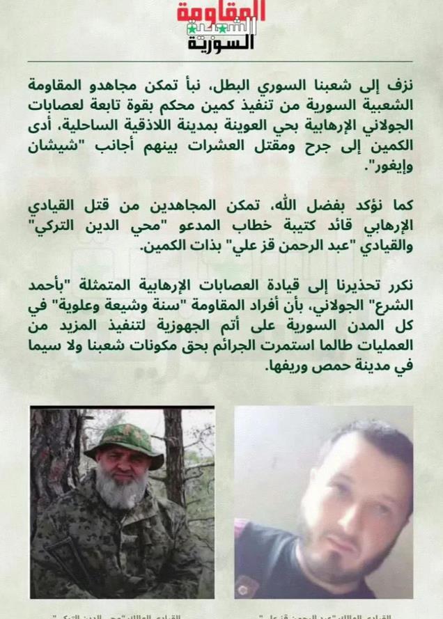 此役战果惨烈得令人触目惊心,叙利亚新政权主力部队伤亡惨重,大批年轻战士血洒疆场,生命戛止。更为致命的是,HTS 王牌 ——“基地” 组织 “哈塔布旅” 旅长穆海乌尔丁?图尔基,这位朱拉尼倚重的亲信,在枪林弹雨中倒下
