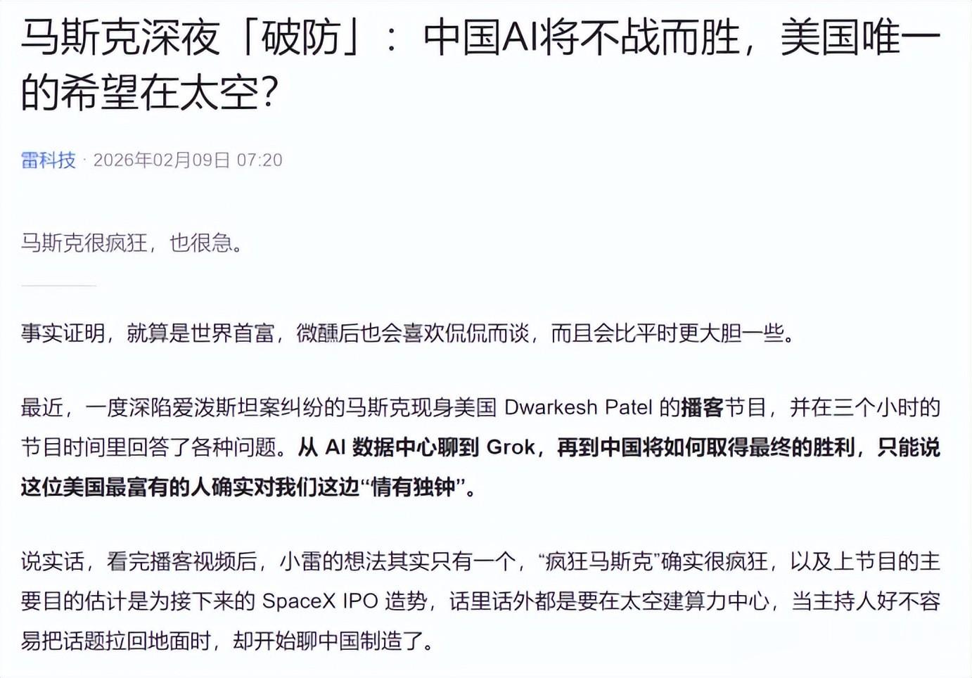 马斯克最近参加了一个播客节目,聊了三个小时。他提到了一个挺有意思的观点:中国在人工智能这块儿,说不定能躺赢。