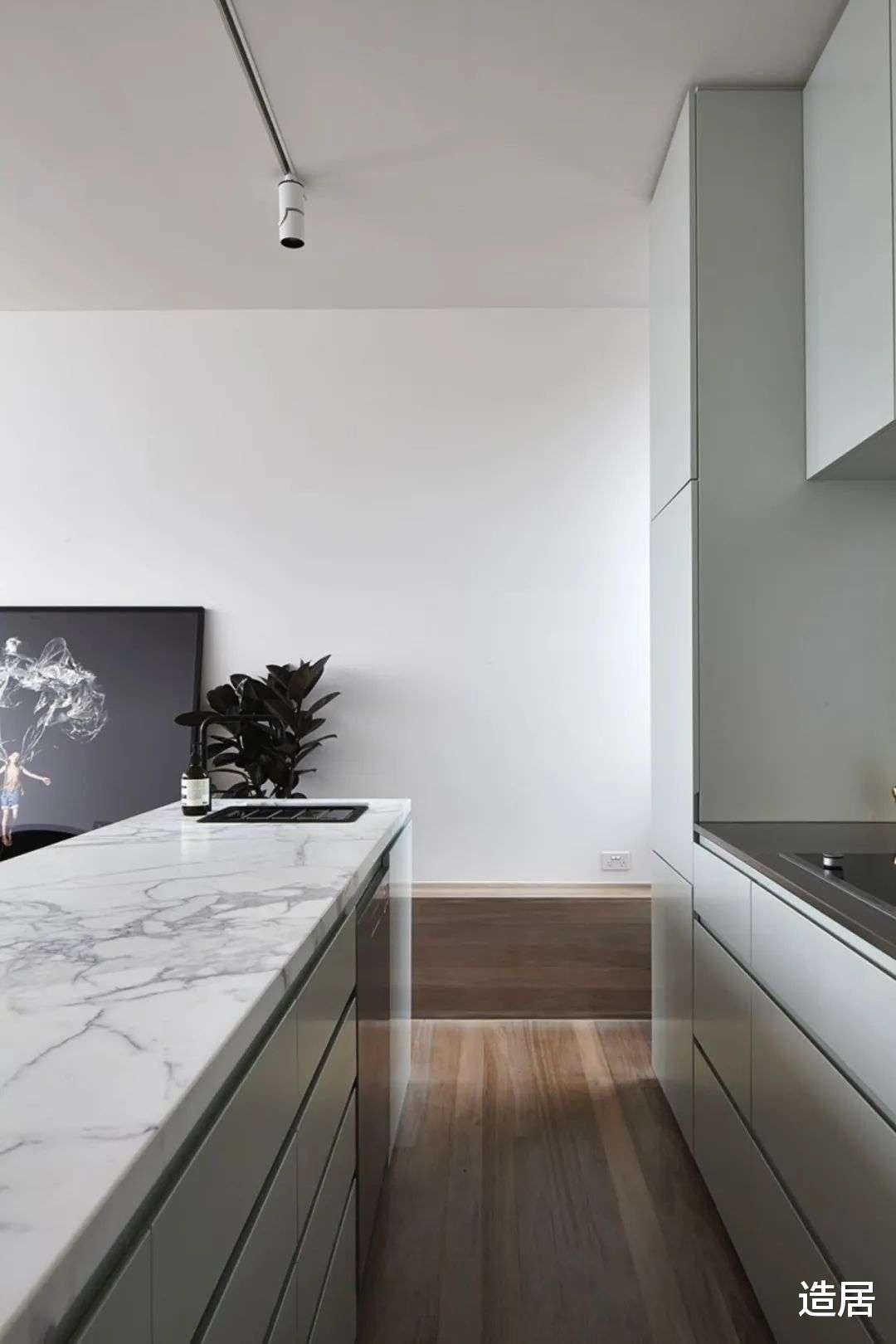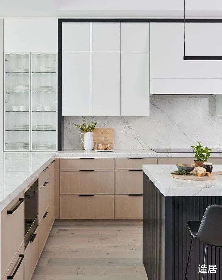 当然得结合不同餐厨面积以及布局,不一定所有烹饪活动都挤在一个小空间内,也可以选择开放式的餐厨设计,结合餐边柜和橱柜,做家电嵌入式一体化设计。