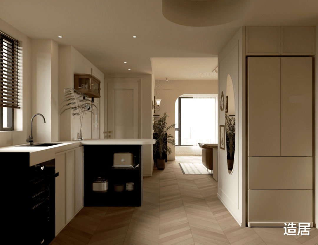 而烤箱、蒸箱等也要提前看好尺寸,嵌入橱柜后与柜门平齐,视觉上更统一。造居君曾有个业主家厨房转角处有块鸡肋空间,在帮他定制了嵌入式高柜,塞进蒸烤箱和小冰箱,瞬间变身 “宝藏收纳区”。
