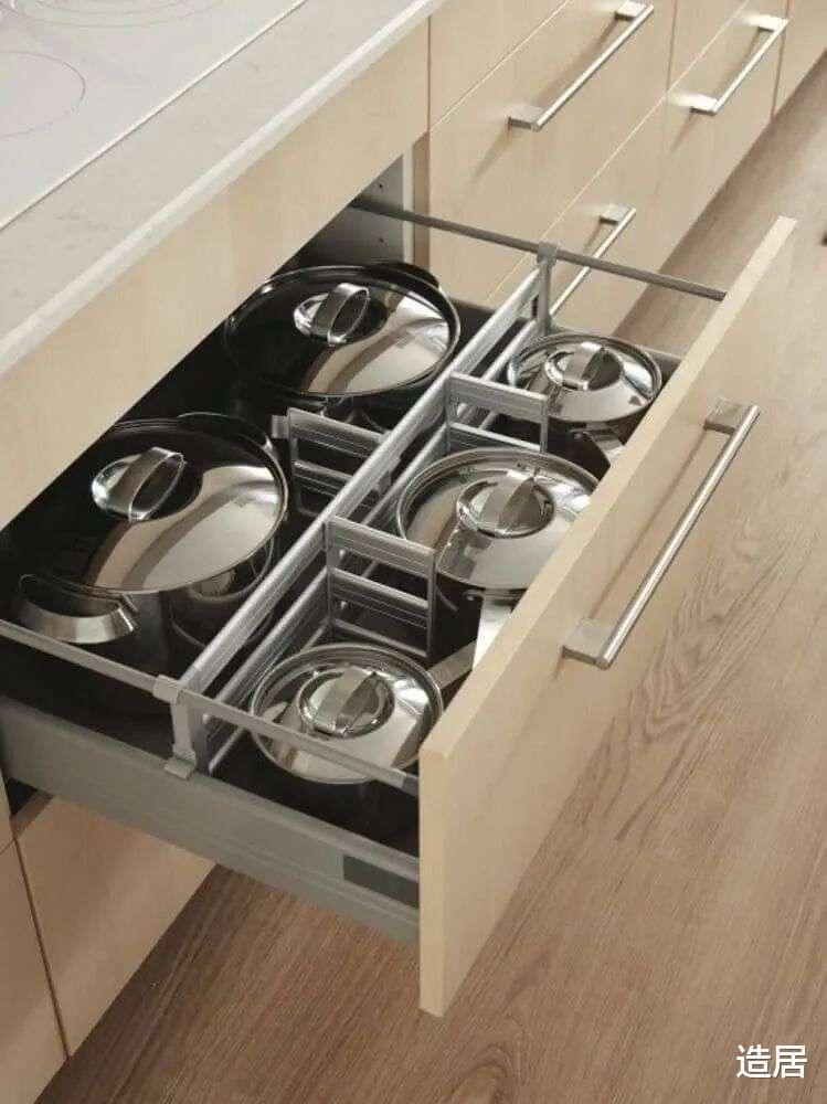 比如碗碟这类,日常藏在地柜部分,可以根据碗、盘的大小,定制可以藏的抽屉和拉篮,让碗、盘可以妥善被放置。
