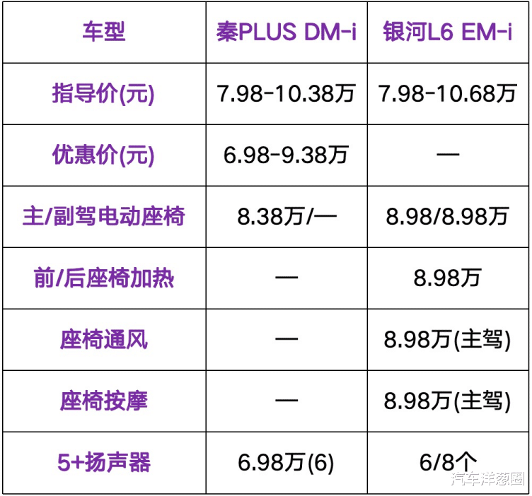 舒适性配置方面,两款车差异更加明显,秦PLUS DM-i的副驾只有手动调节,座椅加热、通风、按摩全系都没有。银河L6 EM-i这边,从8.98万的配置开始,主副驾电动座椅、前排座椅加热,甚至主驾位置的通风和按摩,就都出现了。