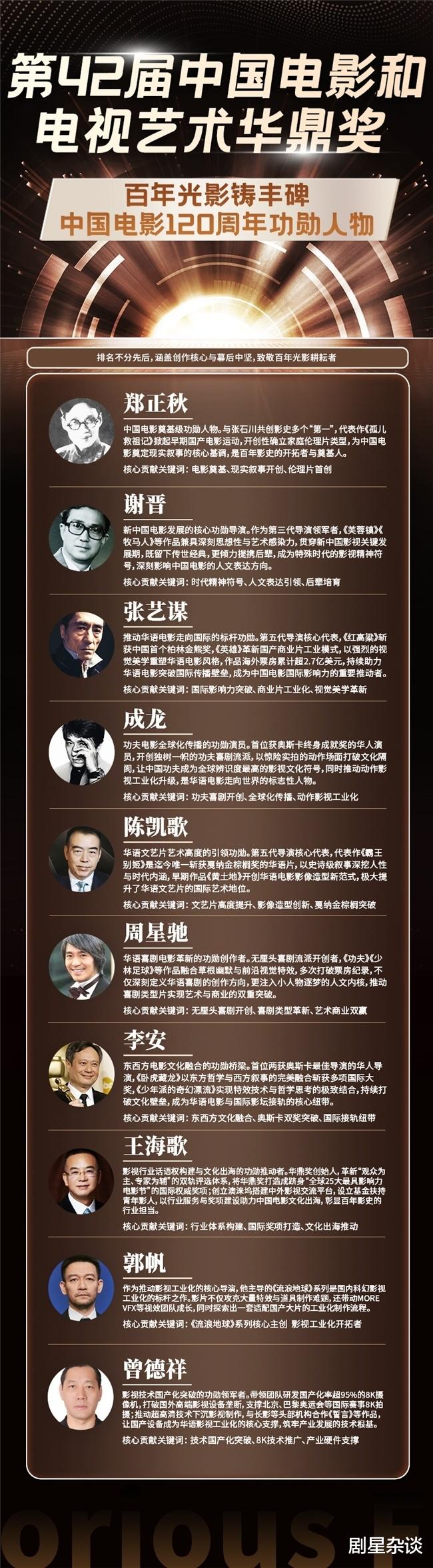 此外,华鼎奖评选不仅关注创作前沿,更聚焦幕后中坚力量的产业贡献。这份功勋名单中,包括了在电影工业体系建设方面做出突出贡献的人物。
