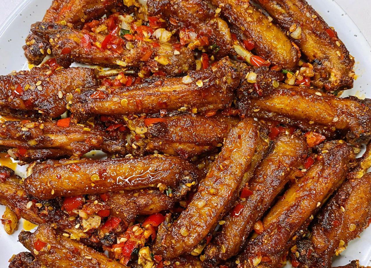 再另起一锅,留少许底油,把蒜末和小米椒碎炒香,倒入炸好的鸡翅,加一勺椒盐、一勺辣椒粉翻炒均匀,最后撒上熟白芝麻和切好的葱花,继续翻炒一会儿。