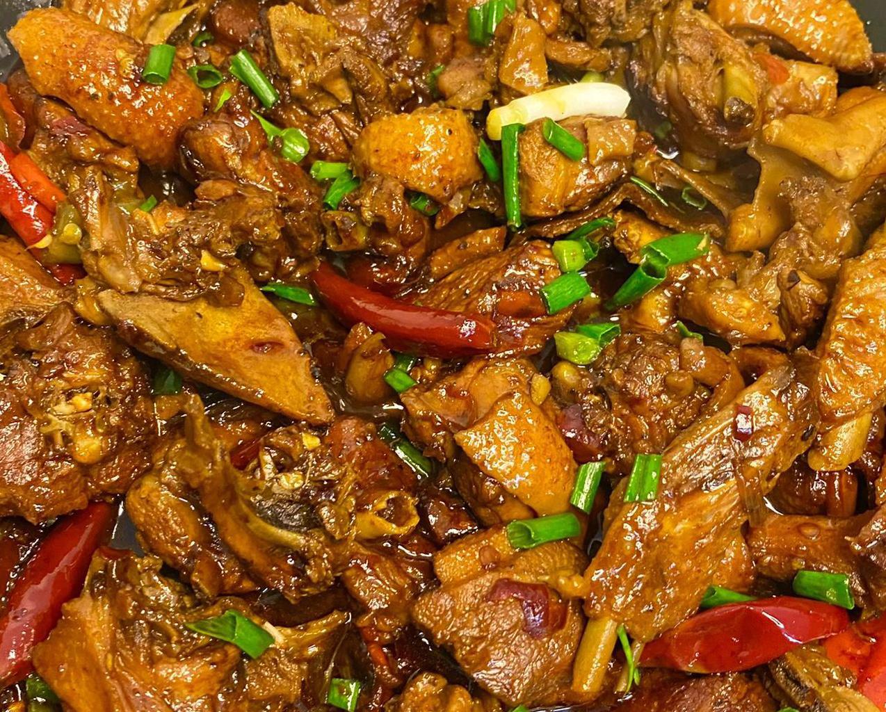 炖到鸭肉用筷子能轻松穿透时,倒入切好的青红辣椒和蒜苗,翻炒一分钟大火收汁即可。