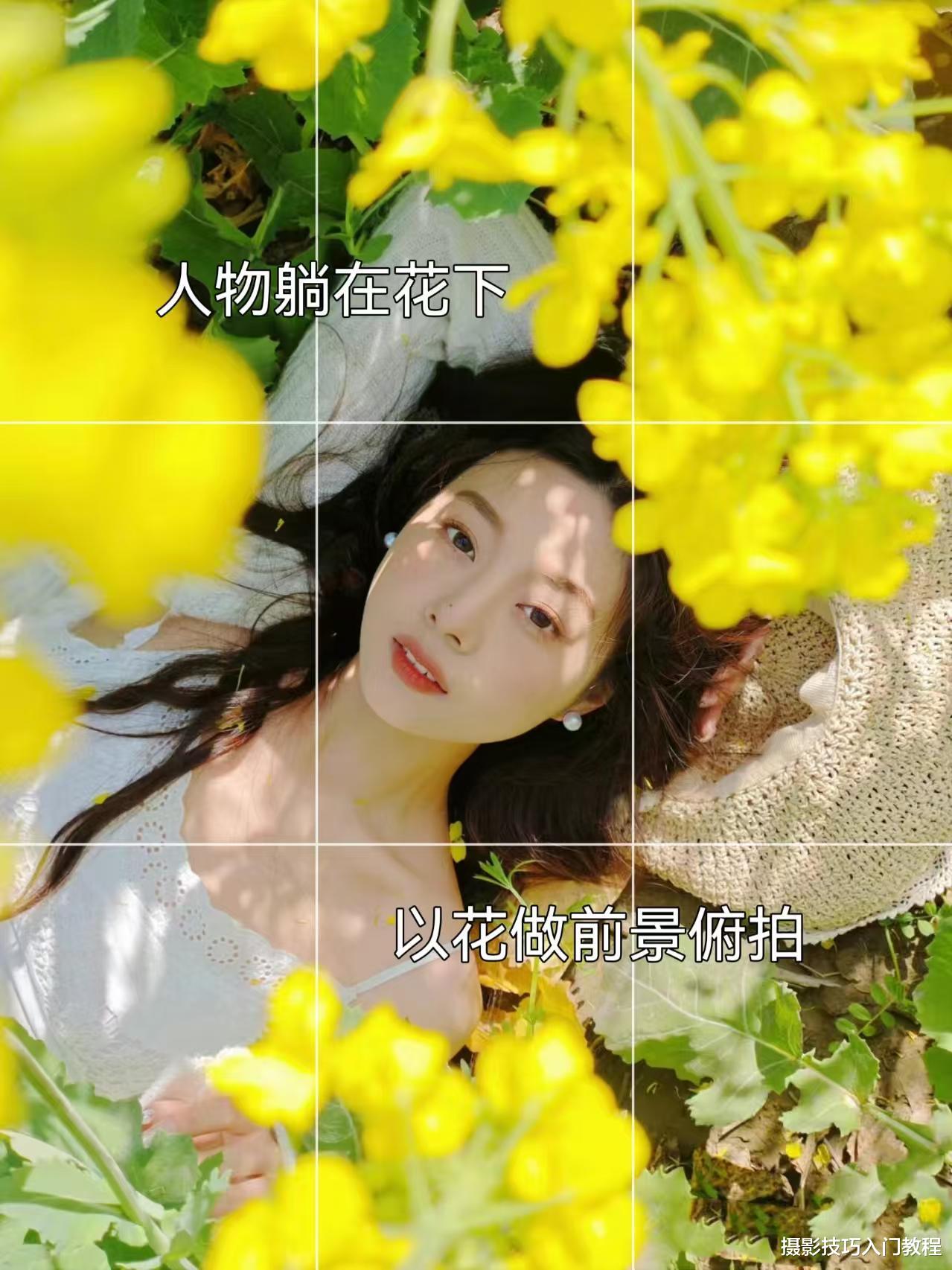 4、人像直接躺在油菜花田中,可以手动将油菜花聚拢起来作为前景。
