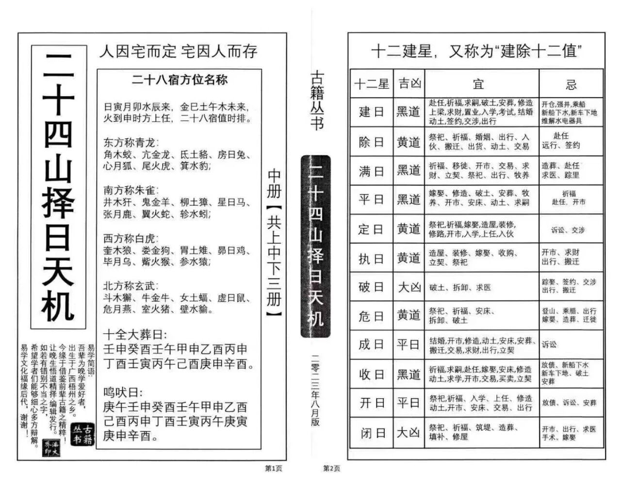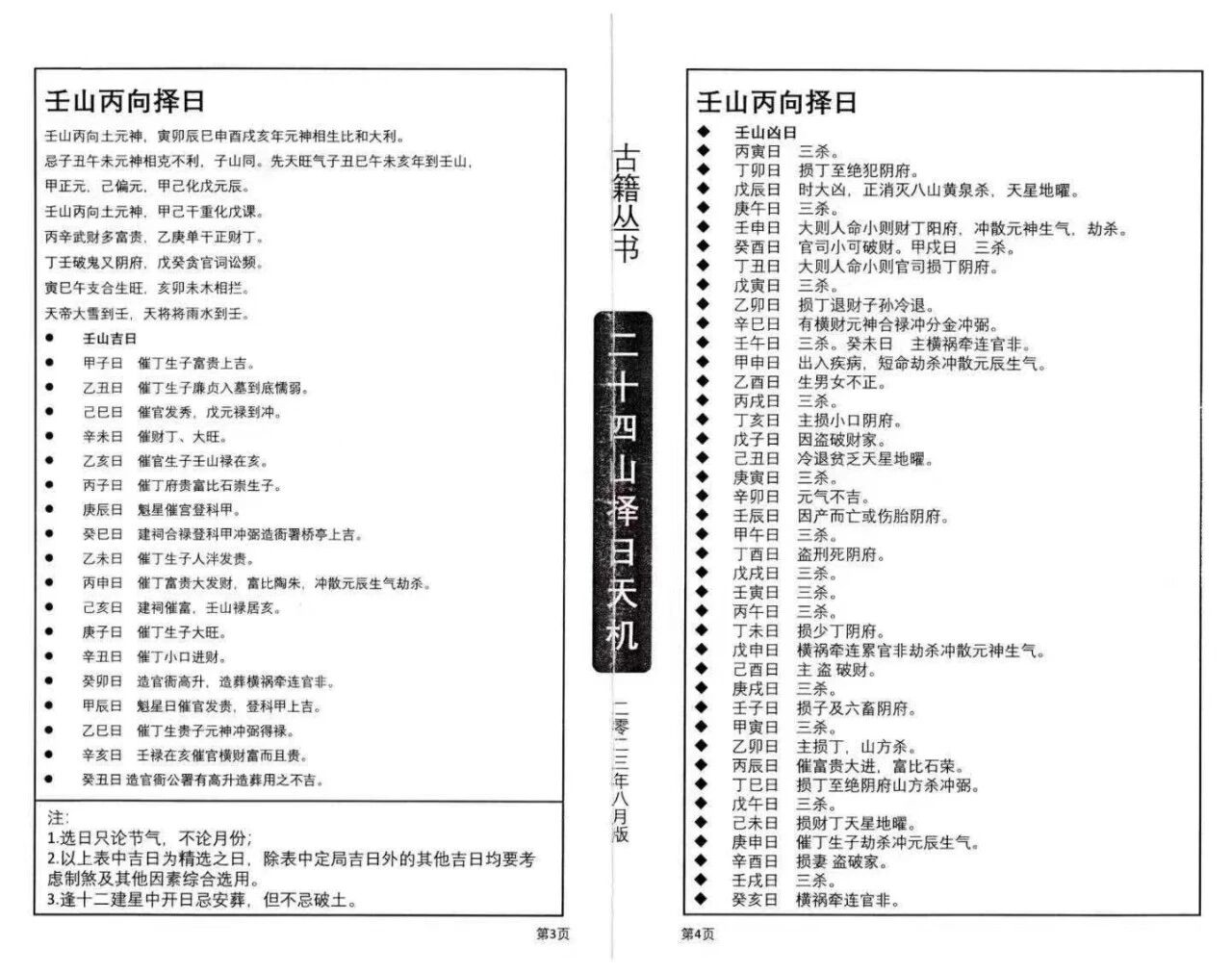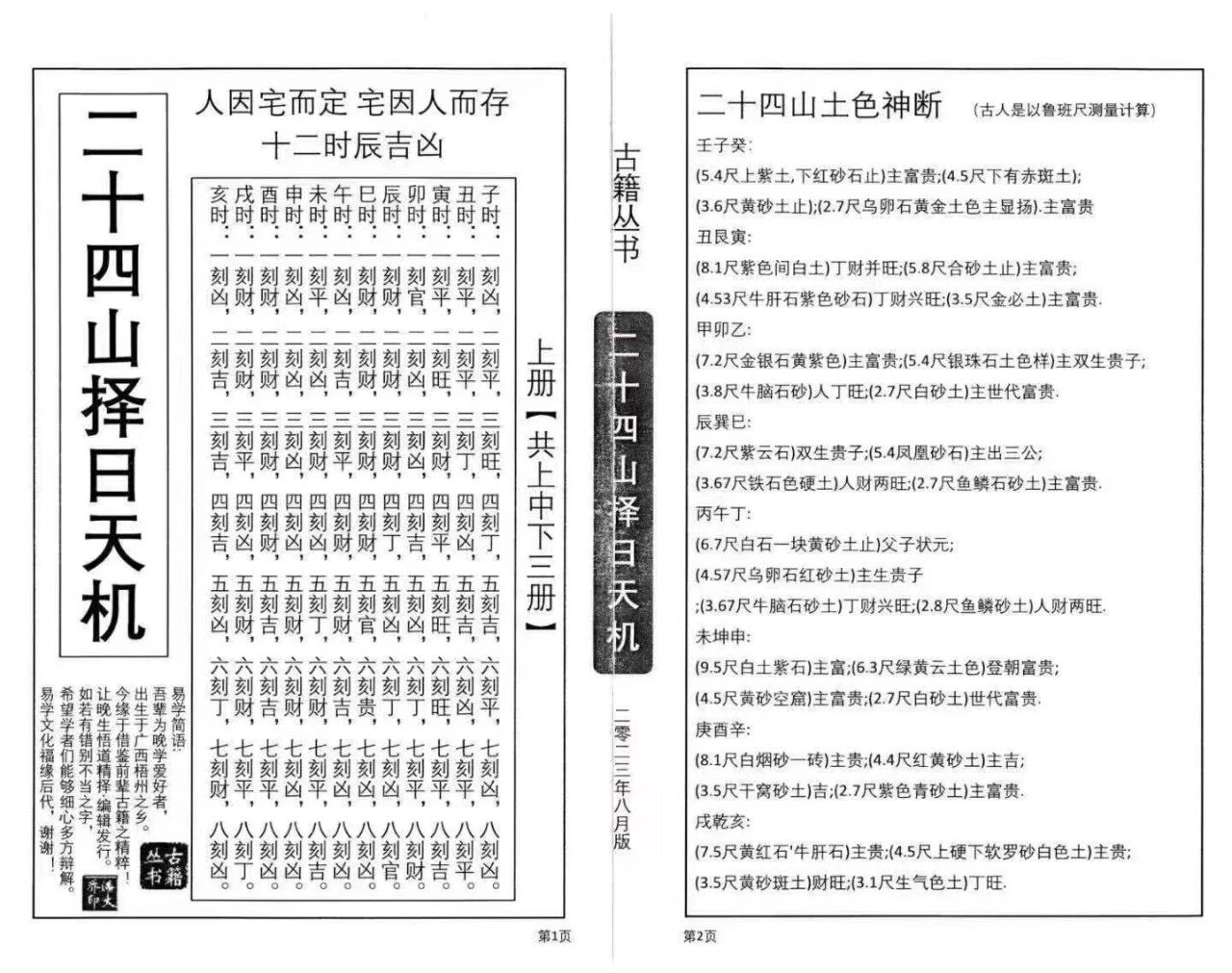 此择日宝典最核心的亮点,在于“上中下3册完整保真、各册页数清晰(上68页+中76页+下60页)、百年流派真传、择日实操全覆盖”,区别于市面普通复刻本,本书三册成套无缺、各册页数完整,字迹清晰、排版规整,完整保留百年流派择日精髓与二十四山择日天机,尽显古法宝典质感,严格承袭风水择日正统体系,依托“方位、干支、流年协同匹配”的核心逻辑,完整保留二十四山择日全套实操方法,无冗余、无讹误,聚焦“成套珍本、实操必备、择吉权威”核心,打破“择日无据、操作不规范、避忌不明”的困境,三册分工明确、层层递进,上册打基础、中册练实操、下册补细节,兼顾专业性与通俗性,全方位覆盖二十四山择日研习与实操需求,更是解读传统择日文化、百年流派精髓的关键典籍。
