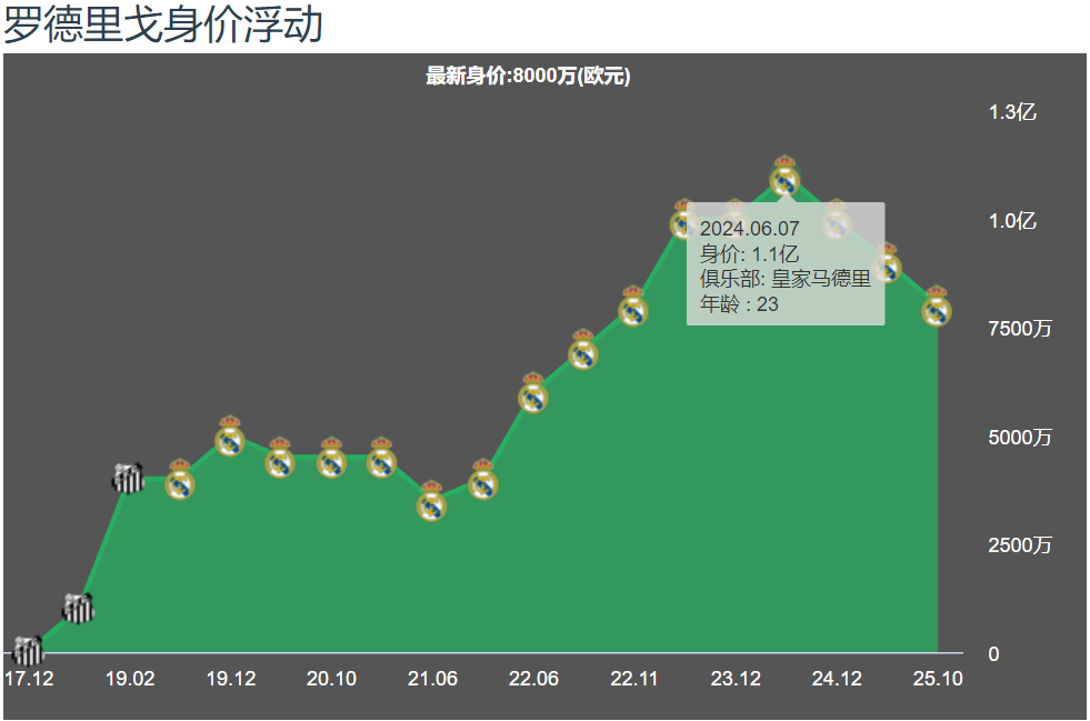 罗德里戈的市场价值已明显贬值,去年6月,罗德里戈的德转身价曾达到1.1亿欧高位,现在已经跌到8000万欧。