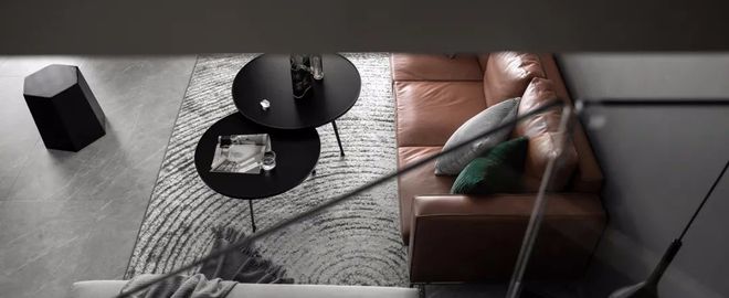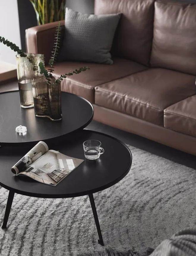 在整体灰色调的空间,搭配上两张圆形的黑色托盘茶几,摆上焦糖色的皮沙发,布置上绿植的装饰点缀,让空间显得简约端庄而又活泼高档。