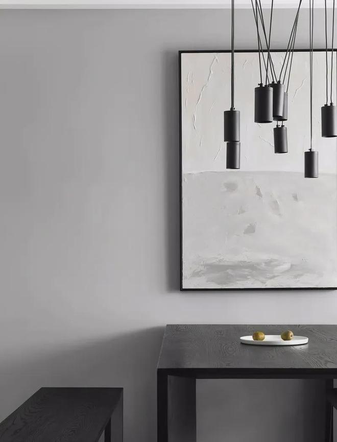 浅灰色墙面上挂着灰白色的的朦胧抽象装饰画,上方装一盏黑色多头的吊灯,也让餐厅充满精致的仪式感。