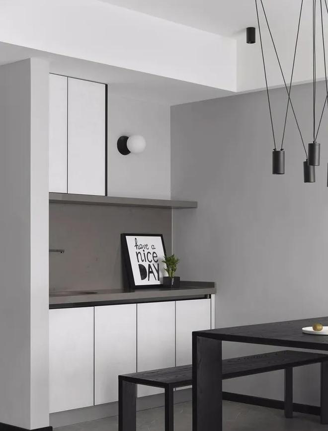 餐厅在灰色地面砖基础,布置黑色实木餐桌与板凳,后方定制白色餐边柜中间加入西厨操作台,布置黑白色的装饰画,还有小盆栽的装饰,也让用餐氛围充满现代优雅的高级感。