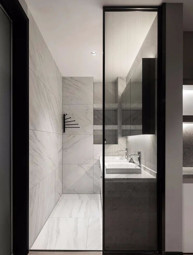 卫生间以雅白的墙面与地面砖,双人位的台上盆+镜柜组合,镜柜底部顶部都装上灯带,侧边加入壁龛,在过道与洗手盆之间也是装上一道屏风,呈现出一个现代时尚的卫浴空间感。