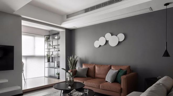 客厅整体灰色的地面砖与沙发墙,地面铺上灰色地毯、沙发墙挂上一组圆形的白色装饰,整个客厅都充满自然舒适的简约氛围感。客厅旁边的阳台也是打通纳入到客厅空间,让整个空间更加明亮宽敞。