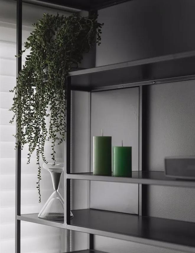 黑色的收纳展示架上,布置花瓶与装饰品,简洁而又高级大气。