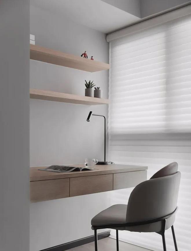 客厅旁边的阳台做了个抬高地台,窗户装上百叶帘,把这个小区域布置出工作休闲兼具的功能空间。
