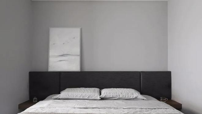 现代简约的卧室以浅灰色的空间,床头墙脚区域加入黑色的软包靠背,靠放一幅简约洁白的装饰画,布置上灰色条纹的床单,也让空间显得更加舒适自然,在窗边布置收纳柜与梳妆台,也是显得实用而方便。