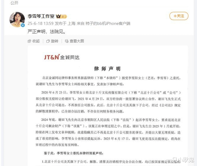 不禁让人好奇,老谢是否会爆出更多关于李雪琴的内幕,而他所说的又是否属实?就在大家纷纷猜测之际,李雪琴方面发布了律师声明,明确表示“严正声明,法院见!”