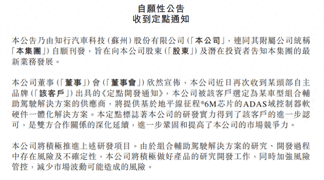 知行汽车科技(苏州)股份有限公司近日发布公告,宣布再次获得某头部自主品牌车型辅助驾驶解决方案定点,将提供基于地平线征程6M芯片的ADAS域控制器软硬件一体化解决方案。