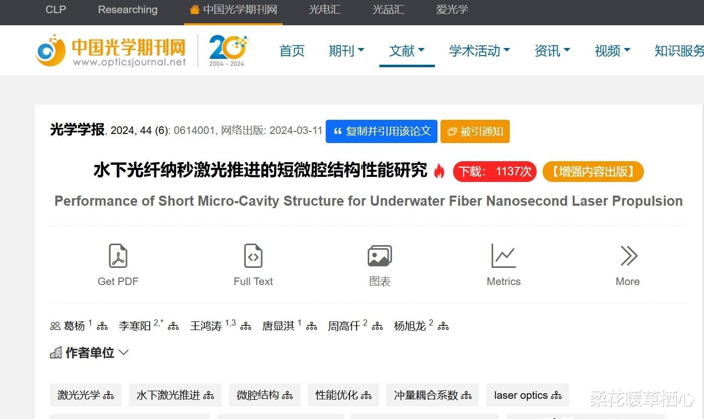 为了进一步求证,我查阅了哈尔滨工程大学团队发表在《光学学报》上的相关论文。论文确实研究了水下激光推进技术,但和“超音速潜艇”完全是两码事。 论文里究竟说了什么? 论文主要研究的是如何提高水下光纤激光推进系统的效率,使用的激光能量是微焦耳级别,与报道中提到的2兆瓦激光差了整整12个数量级! 这就好比说,你拿个火柴去点燃一艘航空母舰,这能行吗?