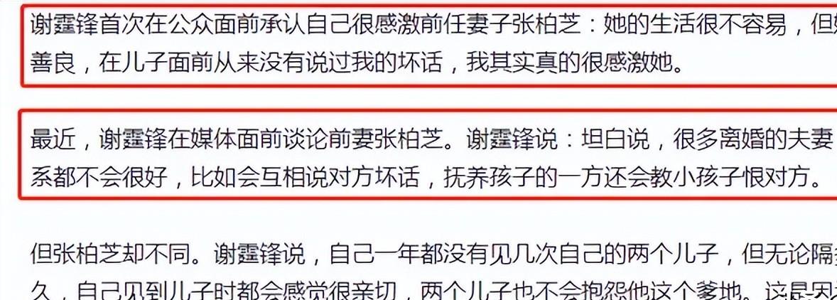 在一次访谈中,谢霆锋特别向张柏芝致谢,指出在许多婚姻解体的情境下,通常随母居的孩子往往会提及父亲的负面形象,而他希望自己的子女能保持对父亲的正面看法。