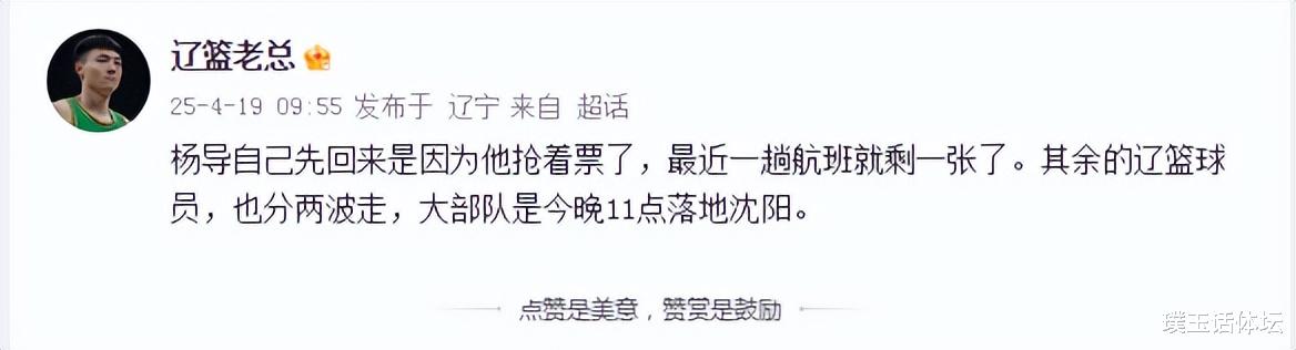 比赛结束不到12小时,上午9点55分,据“辽篮老总”表示:杨导自己先回来是因为他抢着票了,最近一趟航班就剩一张了。其余的辽篮球员,也分两波走,大部队是今晚11点落地沈阳。