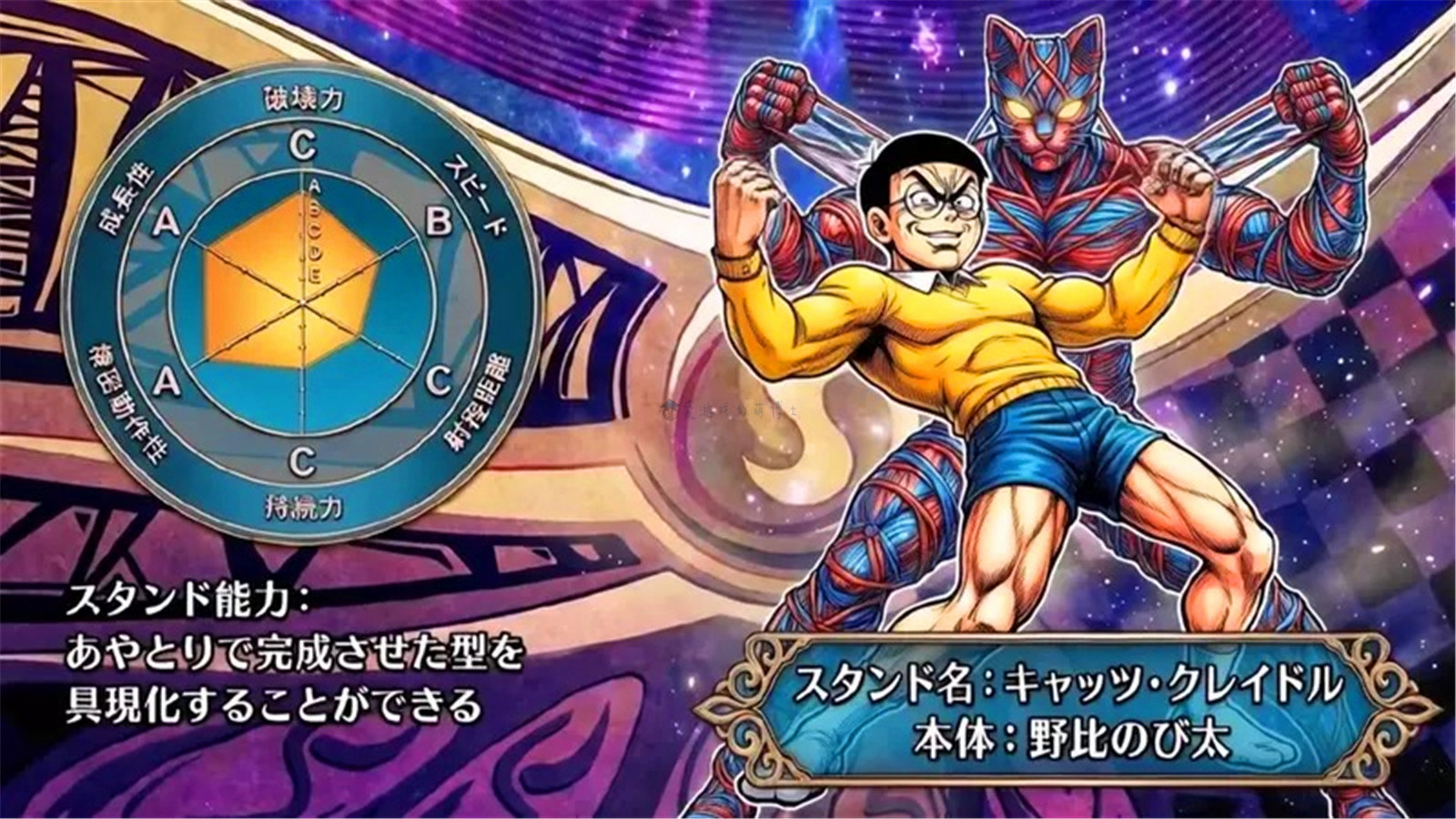 虽然大雄是动漫圈子里的废柴代表,但他也有许多长处,比如:厉害的射击技术、黑白棋技巧且没有睡眠障碍。其中,他可以翻出1000种不同样式的花绳,这是大雄最厉害的一项技能。替身如此设计合情合理,至于为何是猫,大雄最依赖的就是机器猫啊!