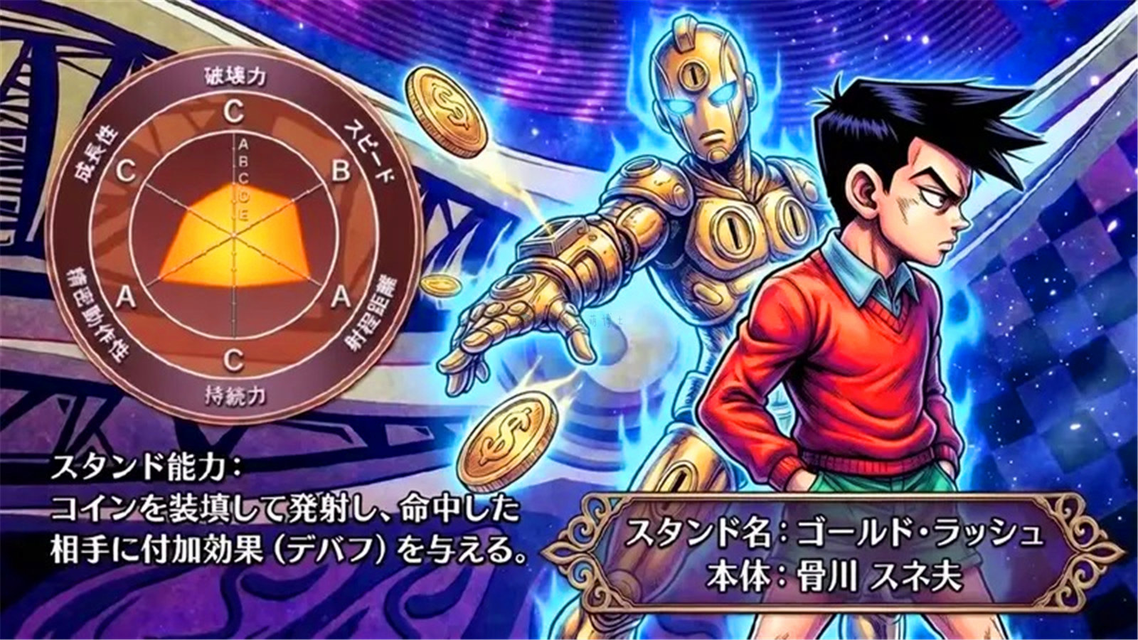 替身能力:装填并发射金币,对命中的对象赋予附加效果(Debuff/负面效果)。