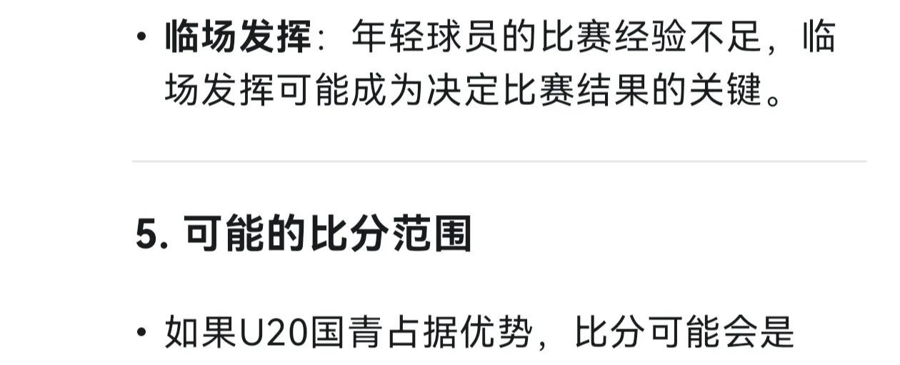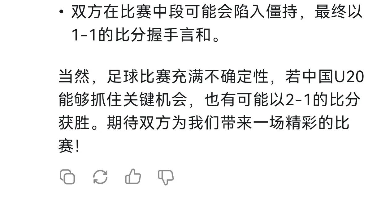 U20亚洲杯开赛前,DeepSeek预测U20国青1-1或者2-1卡塔尔,结果中了一个。