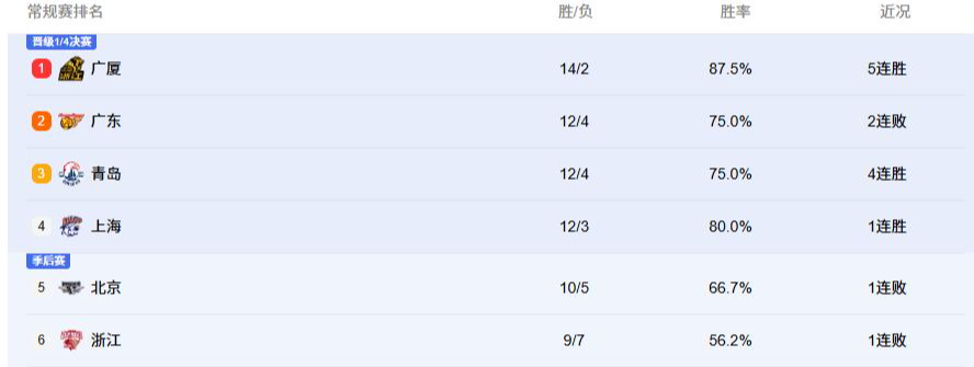 本轮过后,广东男篮和青岛男篮都是12胜4负,广东凭借着胜负优势排在第二,但是少赛一场的上海男篮大概率会超过他们,广厦男篮已经稳居第一了!