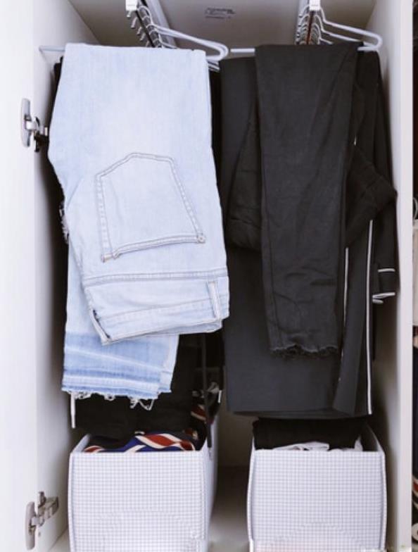 挂放裤子的区域我们可以利用裤架进行收纳,屋主家的这种裤架是安装衣柜的时候由厂家提供的,可以抽拉出来,方便存取物品。如果你家装修的时候忽略了给衣柜内装裤架也不要气馁,现在也有可以自己安装的伸缩折叠裤架,可以自由组合在自家衣柜内。