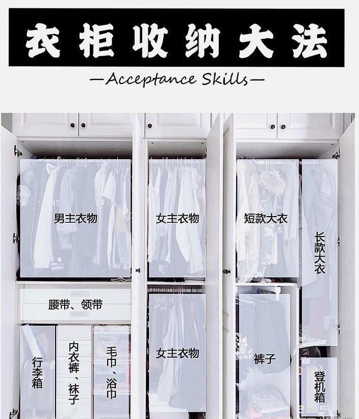 女主人的衣物较多,中间的柜子可以用来收纳女屋主经常穿的当季的衣物。男主的衣服较少,左上角就留给他作为独立挂衣区。中间装一个抽屉,便于存放一些配件,比如腰带、领带等。左下方存放一些数量庞大占用面积小但又很零碎的杂物,比如内衣袜、毛巾、行李箱。最右侧挂上冬装、裤子。2、巧妙借助收纳工具