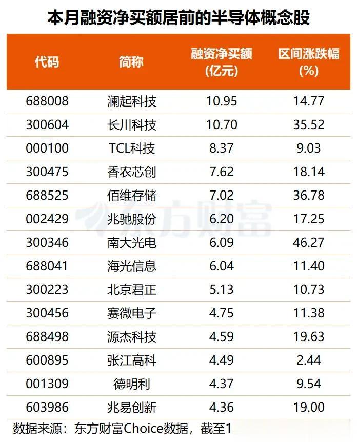 融资客这波操作更是凶悍,杠杆加得满满的。这个月融资净买额超1亿的半导体股就有75只!特别是澜起科技、长川科技,这两只票被融资客抢筹超10亿元,TCL科技、江波龙也被买了8个多亿。佰维存储、南大光电、海光信息这些也被大幅加仓。你看佰维存储,业绩预报一出,2025年营收预计100亿到120亿,净利润更是要大增427%到520%,这业绩,谁不爱?
