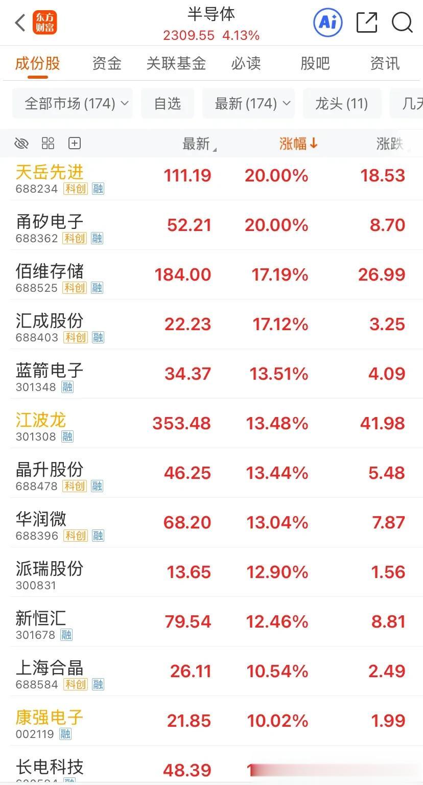半导体板块今天这波走势,是不是让你看得心跳加速?1月16日早盘,这简直就是一场资本的狂欢节!美埃科技、天岳先进这两位大哥直接20CM一字涨停,那气势简直拦都拦不住。康强电子、华谊集团、圣晖集成、长电科技、思源电气等一众小弟也紧跟着封板。就连佰维存储这种“大块头”一度也冲涨超13%,股价还刷新了历史新高。派瑞股份、科翔股份、精测电子、凯德石英这些也是个个涨得欢实,满屏都是红的,看着就让人心里暖洋洋。