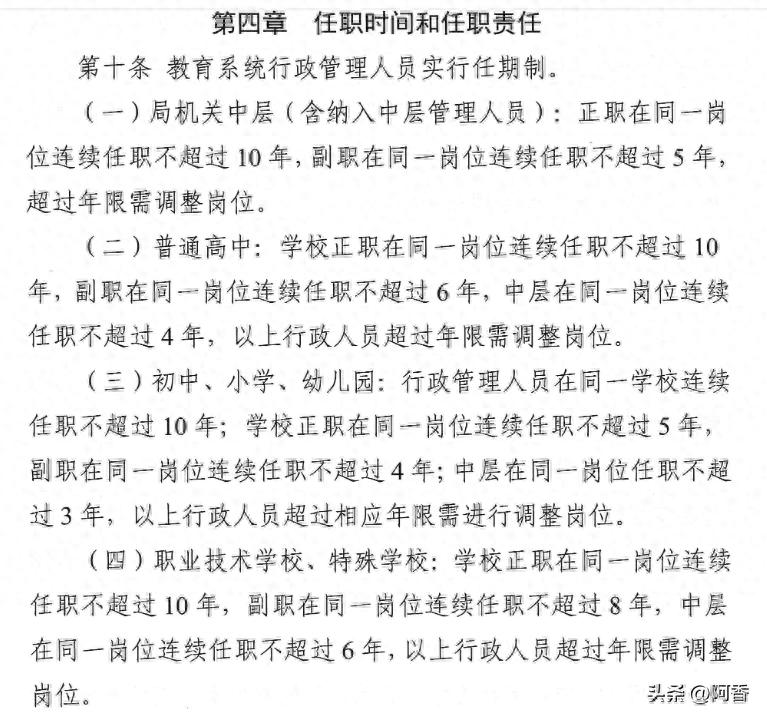 所以现在上级发的这个文件,我认真看了一下,竟然跟我的想法一样,就是对校长到各个主任的任命年限做了新的规定,大概就是校长在一个学校任命最多不能超过5年,副校长最多不能够超过4年,各个主任担任同一岗位不能够超过三年,也就是年限一到全部都要换。