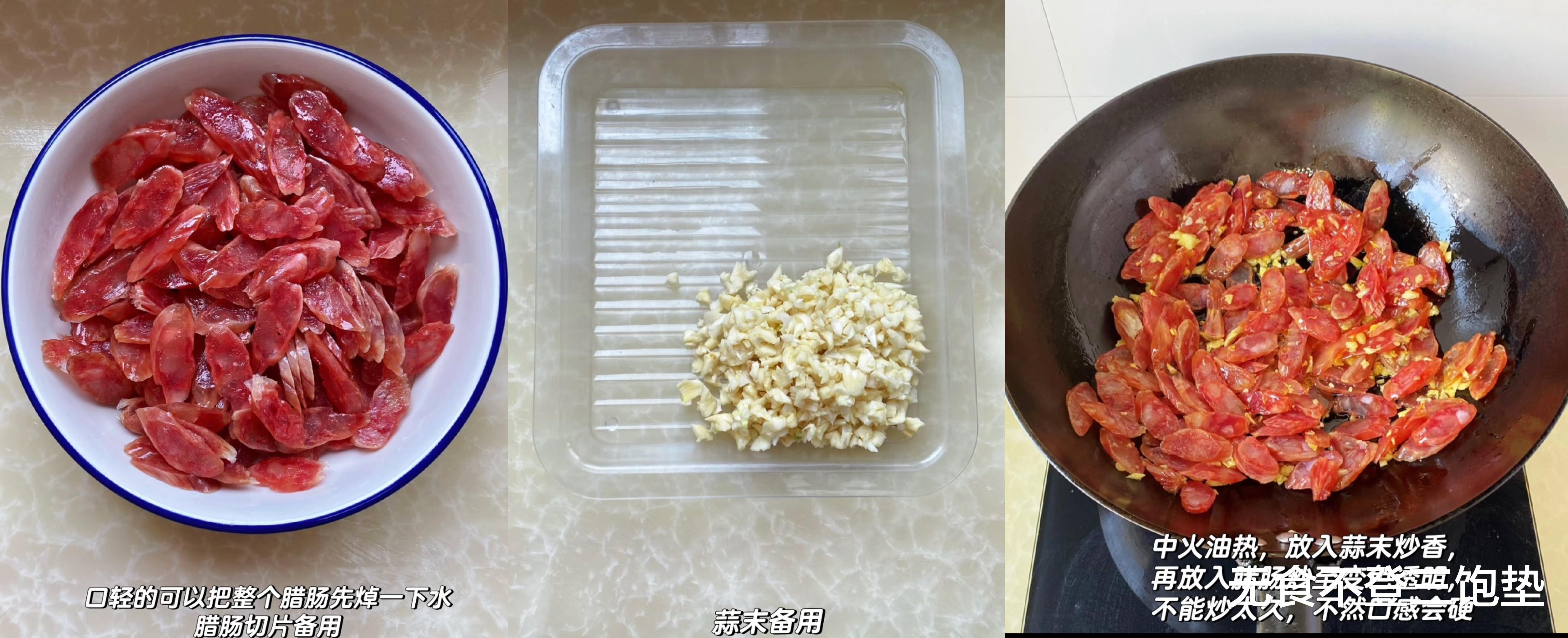 热锅凉油,油热后放入切好的腊肠片,中小火慢慢煸炒。这一步是腊肠出油、增香的关键。当腊肠微微卷曲,边缘变得焦黄,油脂被充分煸出时,香味四溢。此时,加入姜丝和蒜片,继续翻炒出香味。注意,腊肠本身带有咸味,所以后续调味时要适量减少盐的用量。