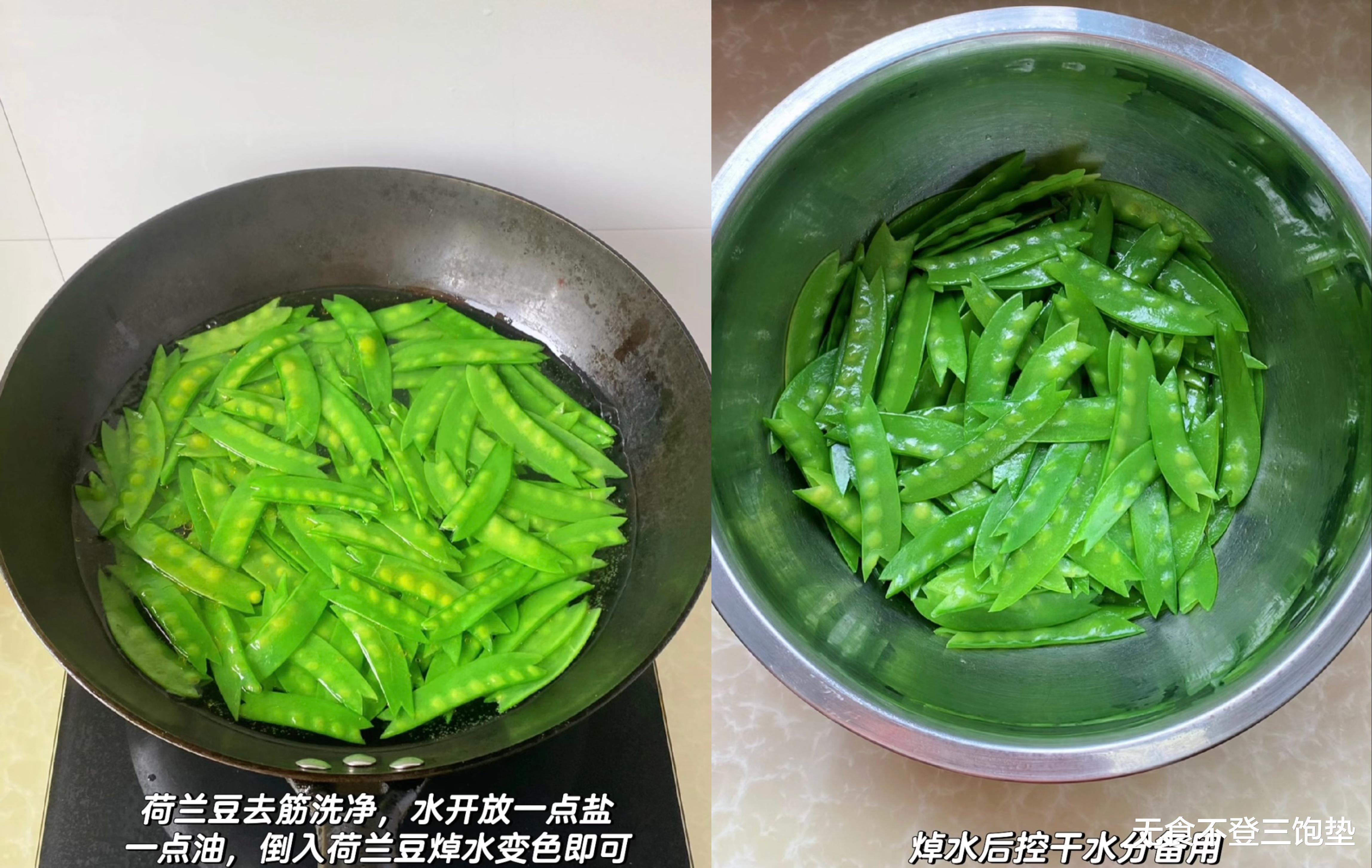 接下来是处理荷兰豆。将洗净的荷兰豆放入沸水中焯烫约1-2分钟,加入少许盐和几滴油,这样焯出的荷兰豆颜色更加翠绿。焯好后,捞出迅速放入冷水中过凉,沥干水分备用。这一步不仅能保持荷兰豆的清脆口感,还能缩短后续炒制的时间,使其更加鲜嫩。
