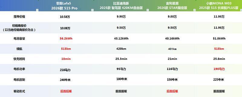 手握10万的预算,能够入手的星愿、海豚版本续航大多在400km左右,小鹏MONA M03的续航更长,但是,它的起步价格都要11.98万,最低配全部办下来都要12万多。相对而言,零跑Lafa5 2026款 515 Pro,实际裸车优惠后的价格为10.08万,续航里程达到了515km,比同价位的星愿、海豚足足多了100km左右,而且零跑Lafa5的中高配版本续航也来到了605Km,不得不说的是续航优势在同级是不言而喻的。