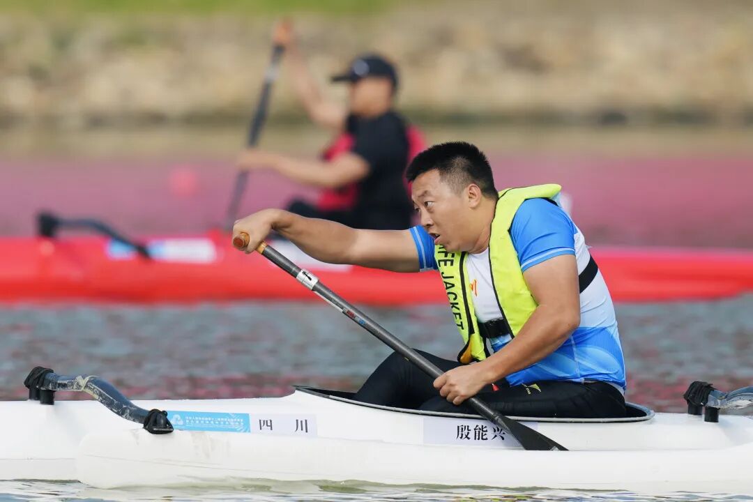 12月11日,全国第十二届残疾人运动会暨第九届特殊奥林匹克运动会皮划艇项目男子500米 VL2级决赛在广东国际划船中心举行。图为四川队选手殷能兴在比赛中。 王鹏 摄